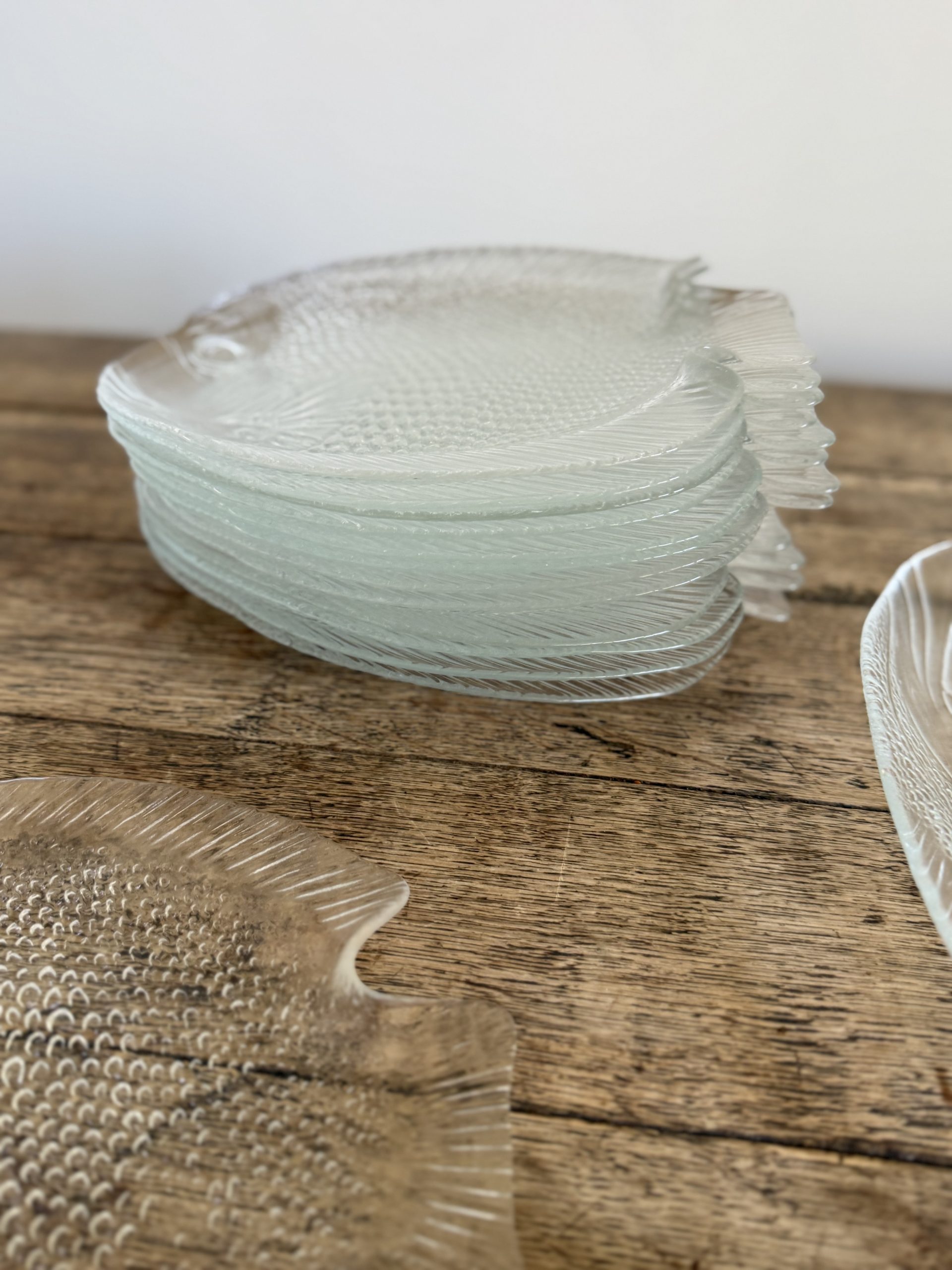 12 assiettes et un plat poisson en verre moulé transparent de la maison Codec, France, années 1970.
