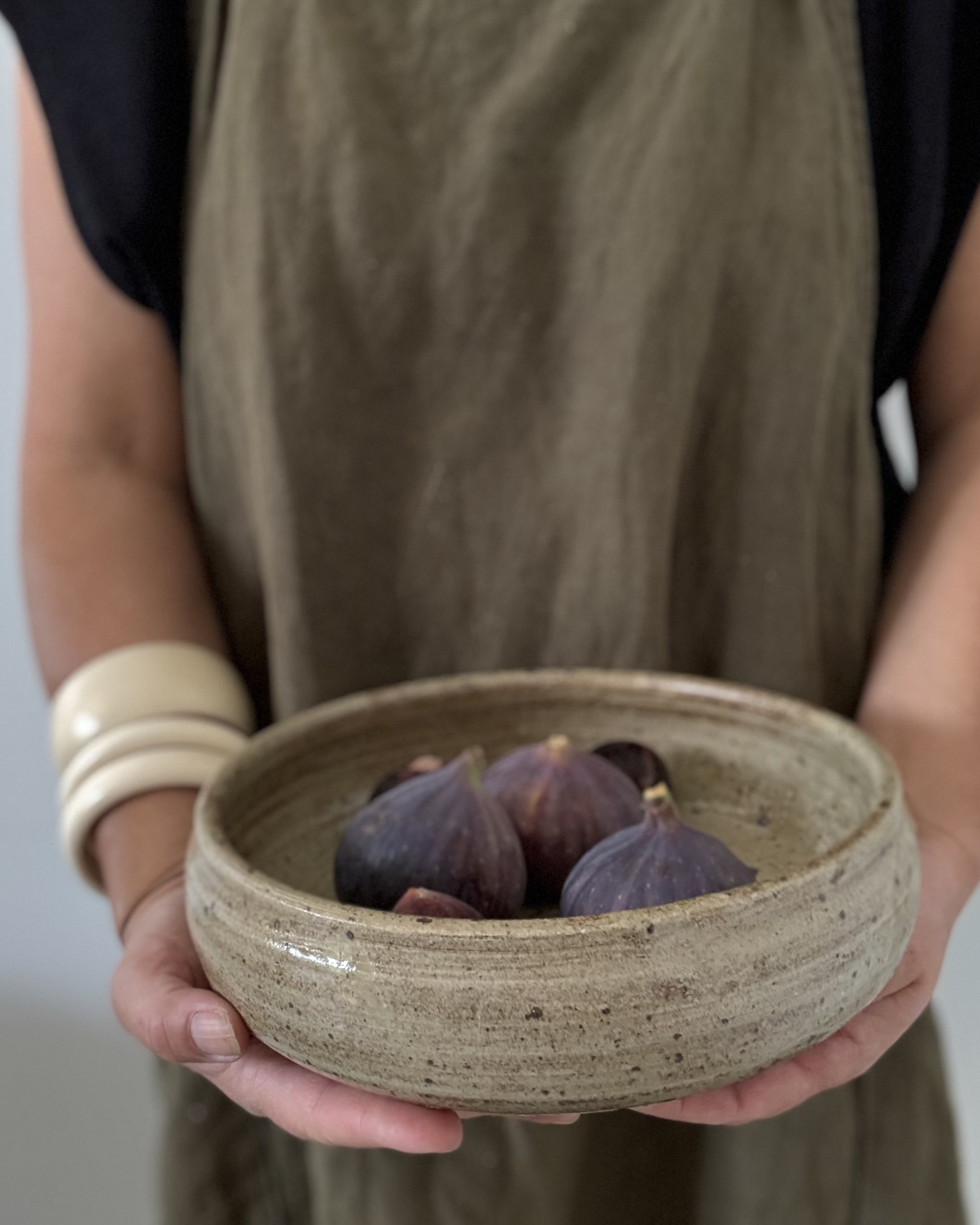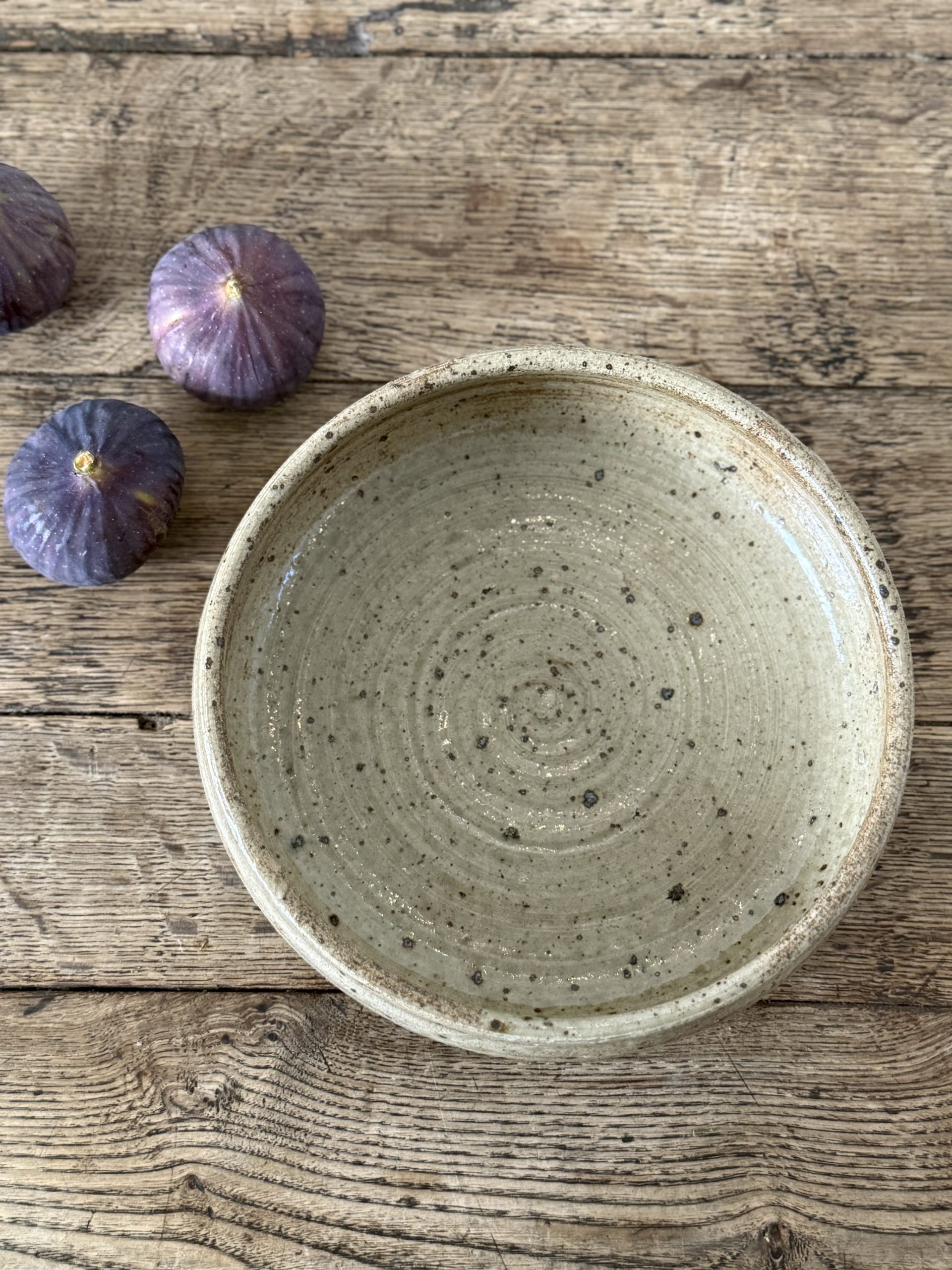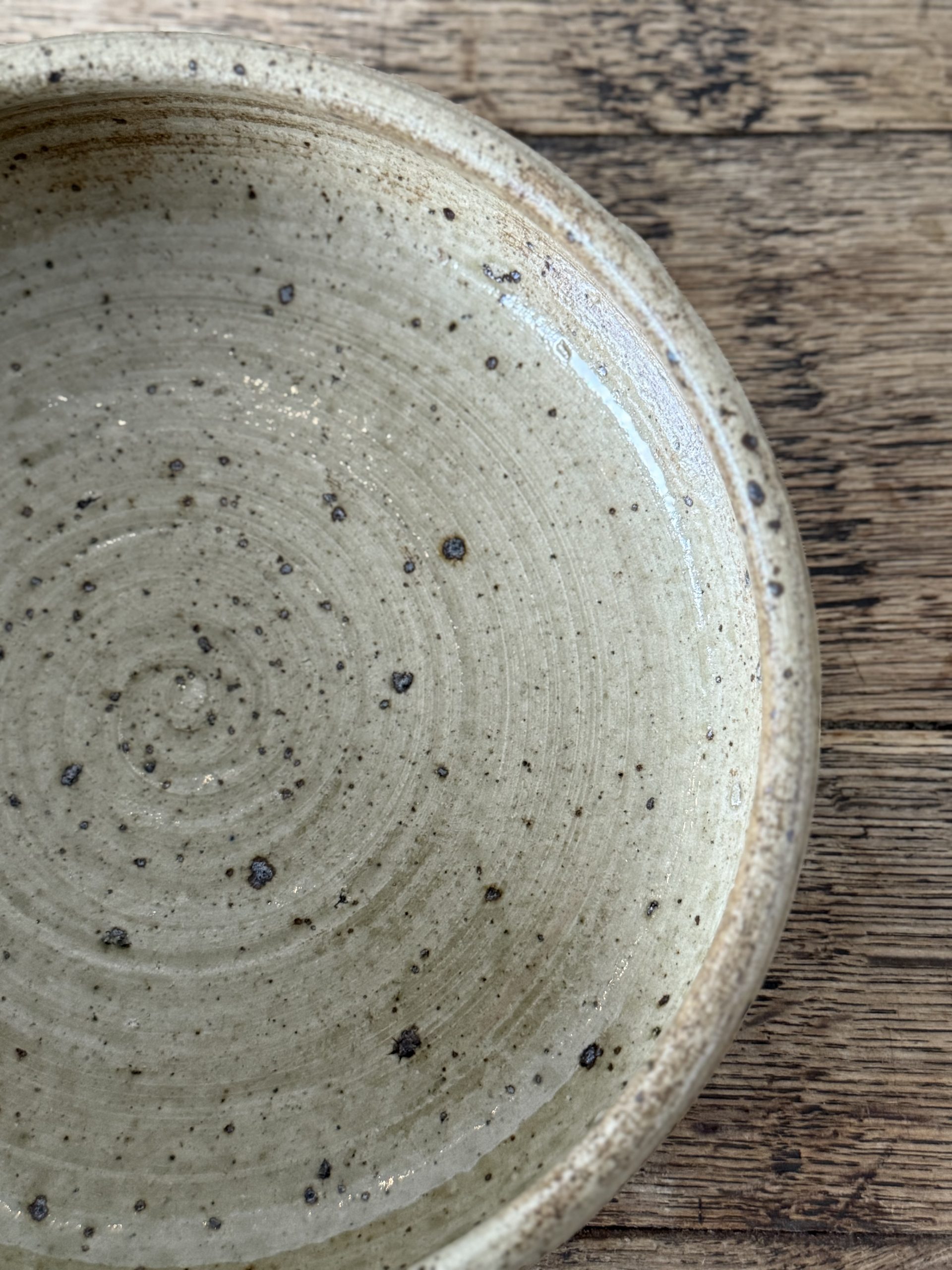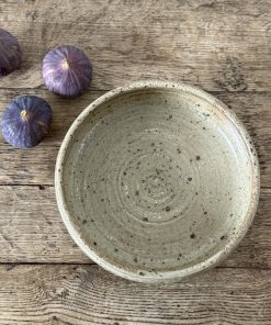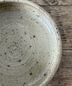 Pièce unique en grès tourné, à l’émail moucheté beige et brun.