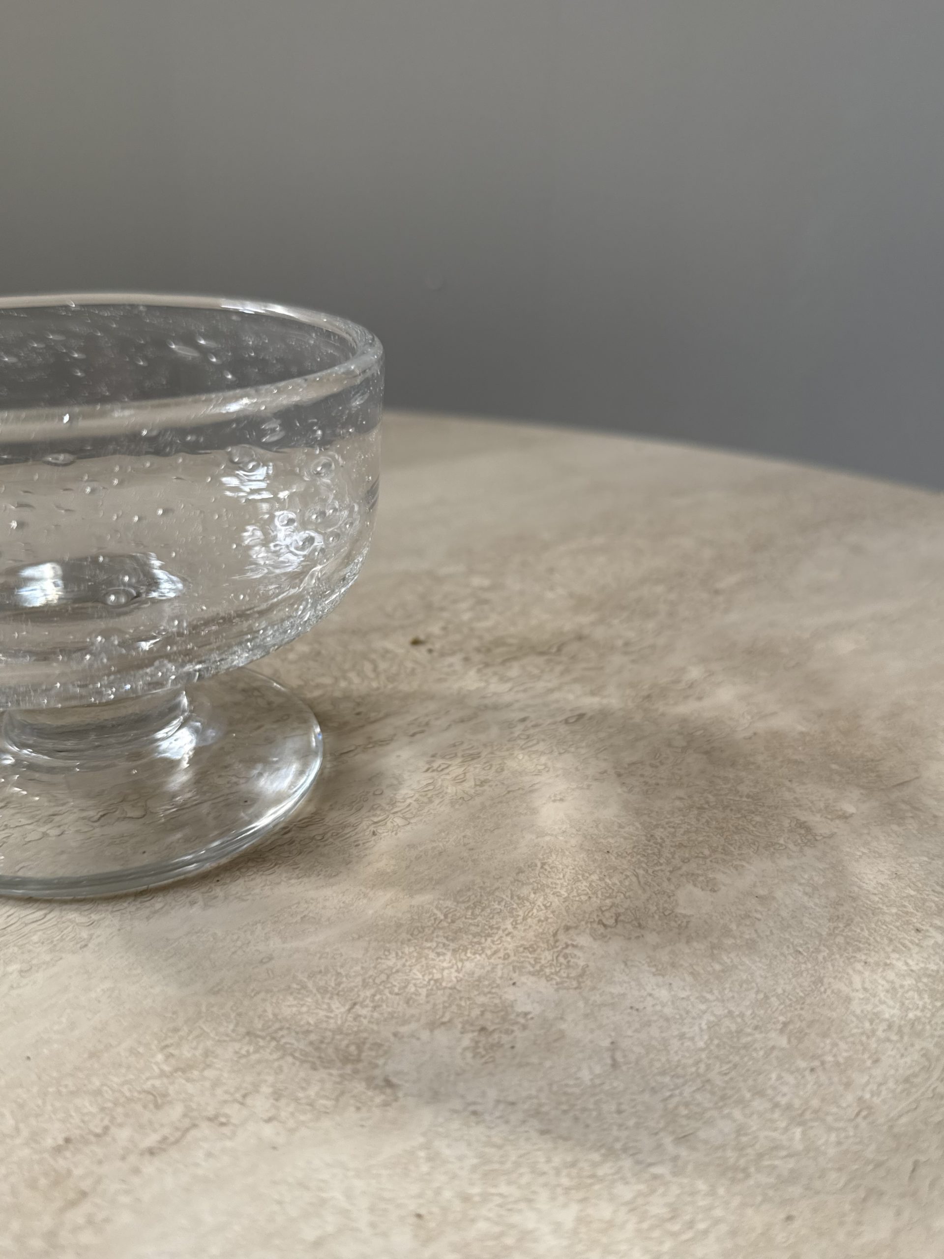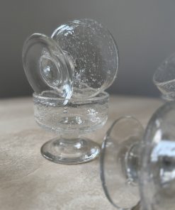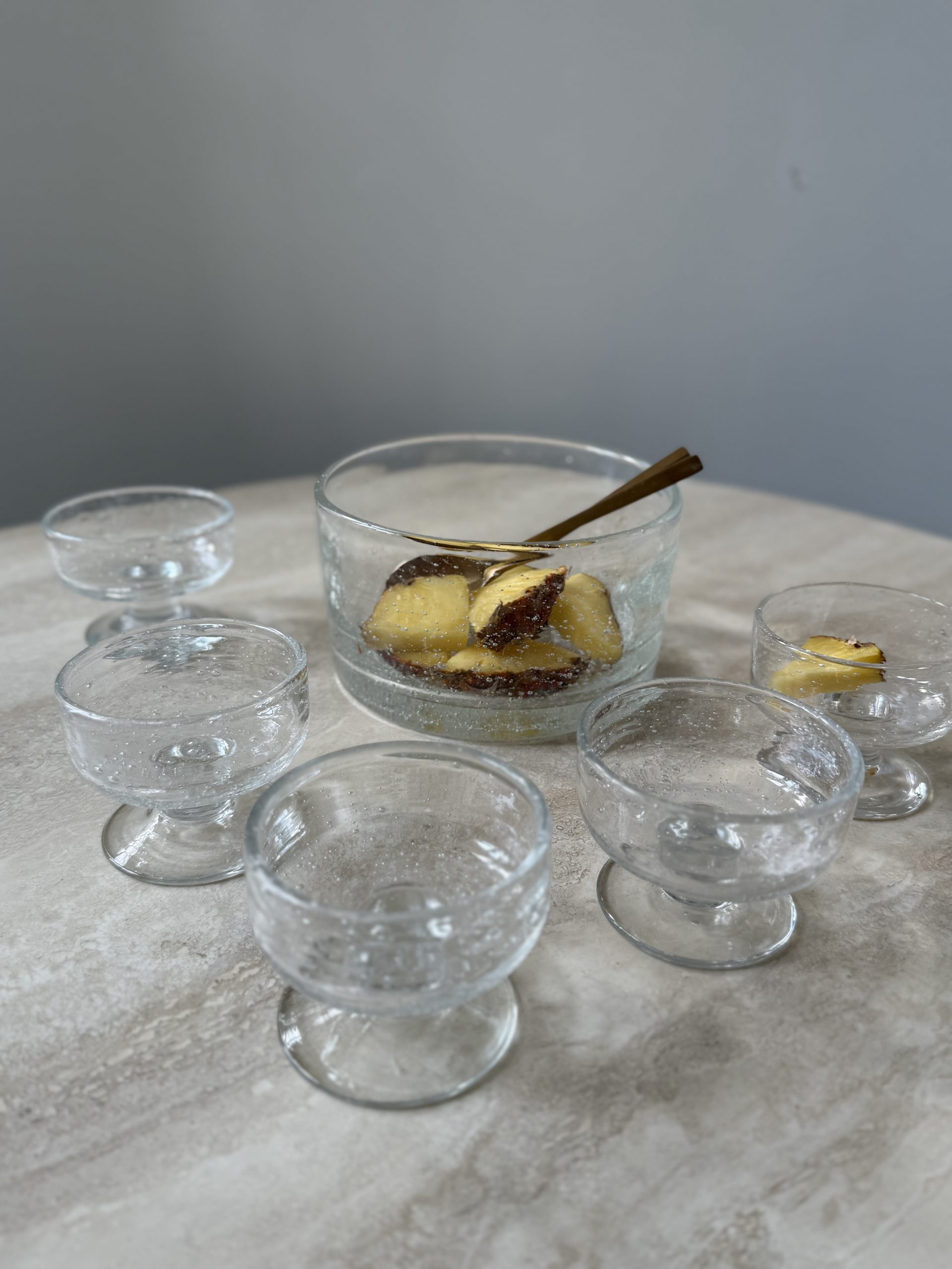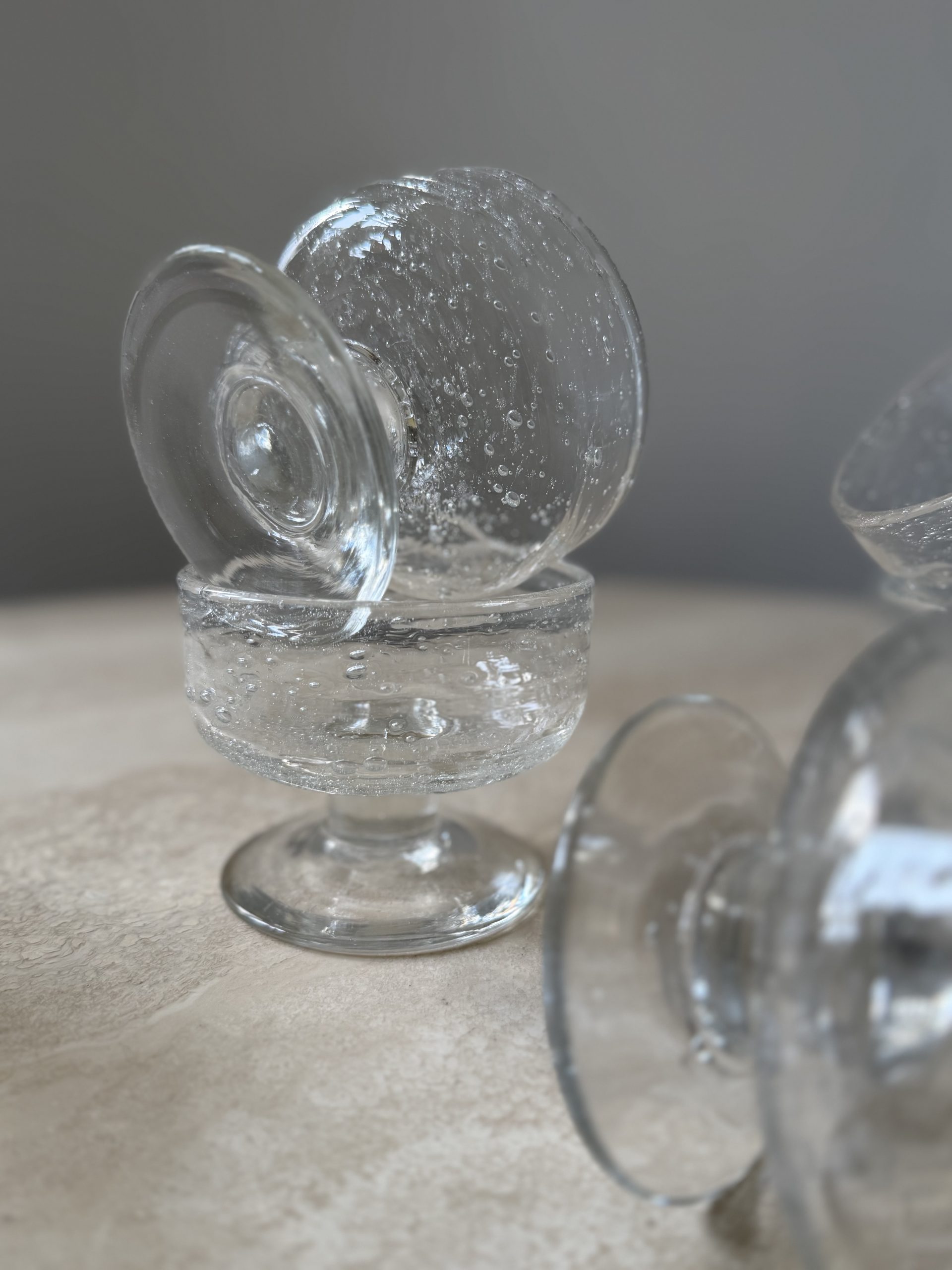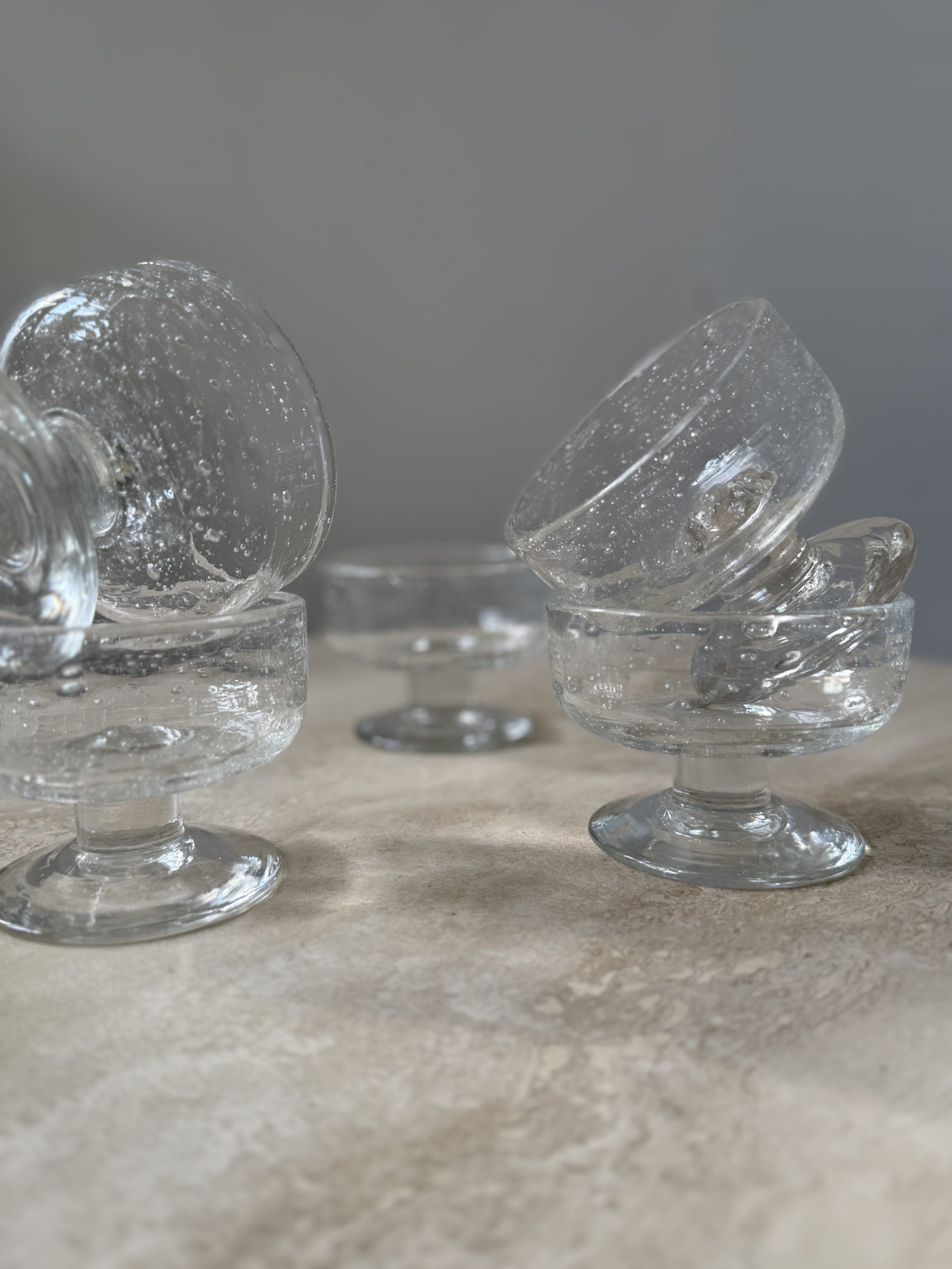 Bel ensemble à dessert en verre bullé composé d’un saladier et de cinq coupes sur pied assorties. Réalisé en verre épais transparent parsemé de nombreuses bulles emprisonnées dans la matière, cet ensemble évoque les productions artisanales provençales Biot, très populaires dans les années 1960 et 1970.