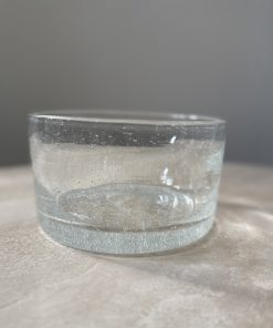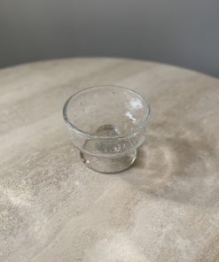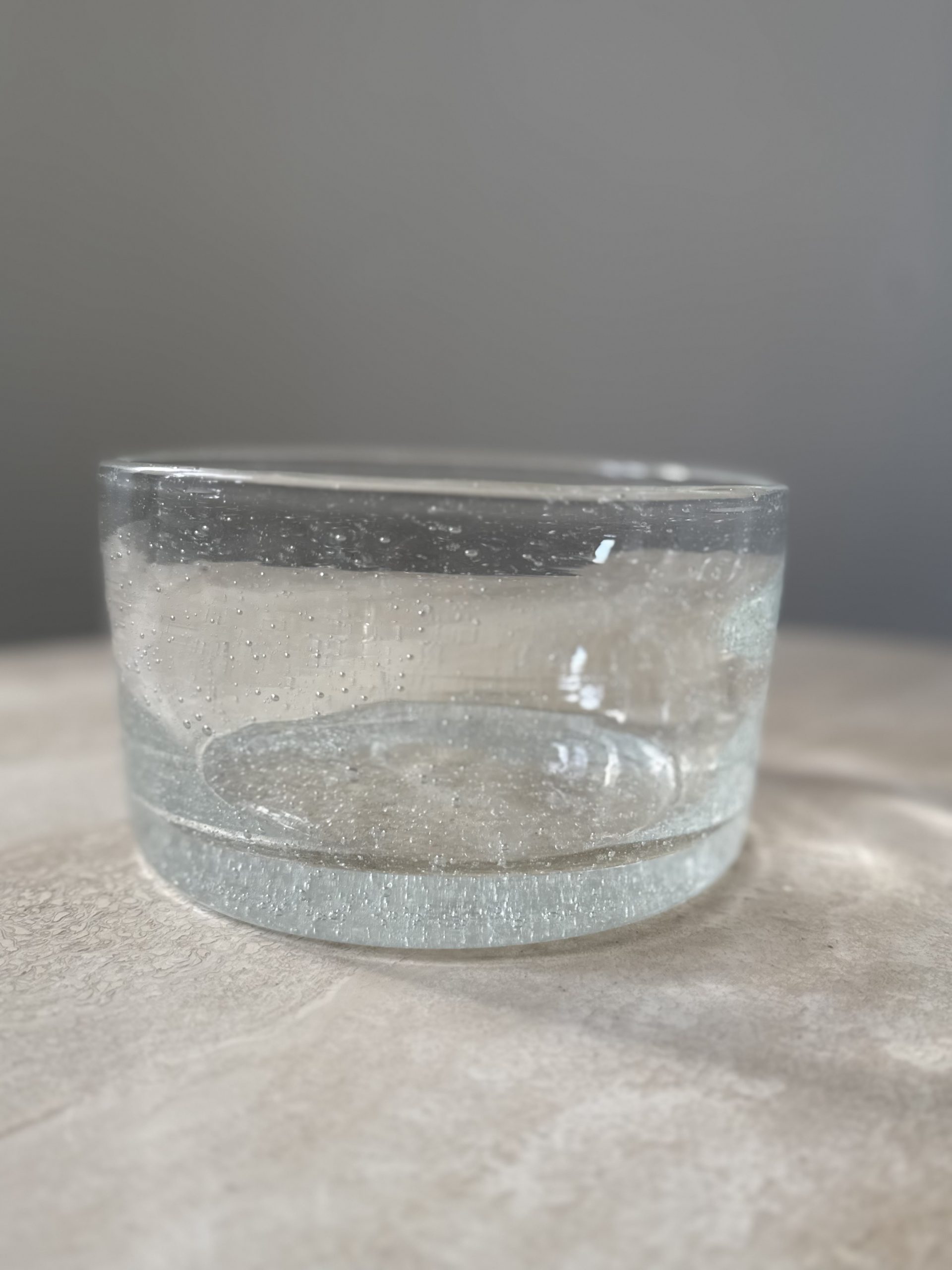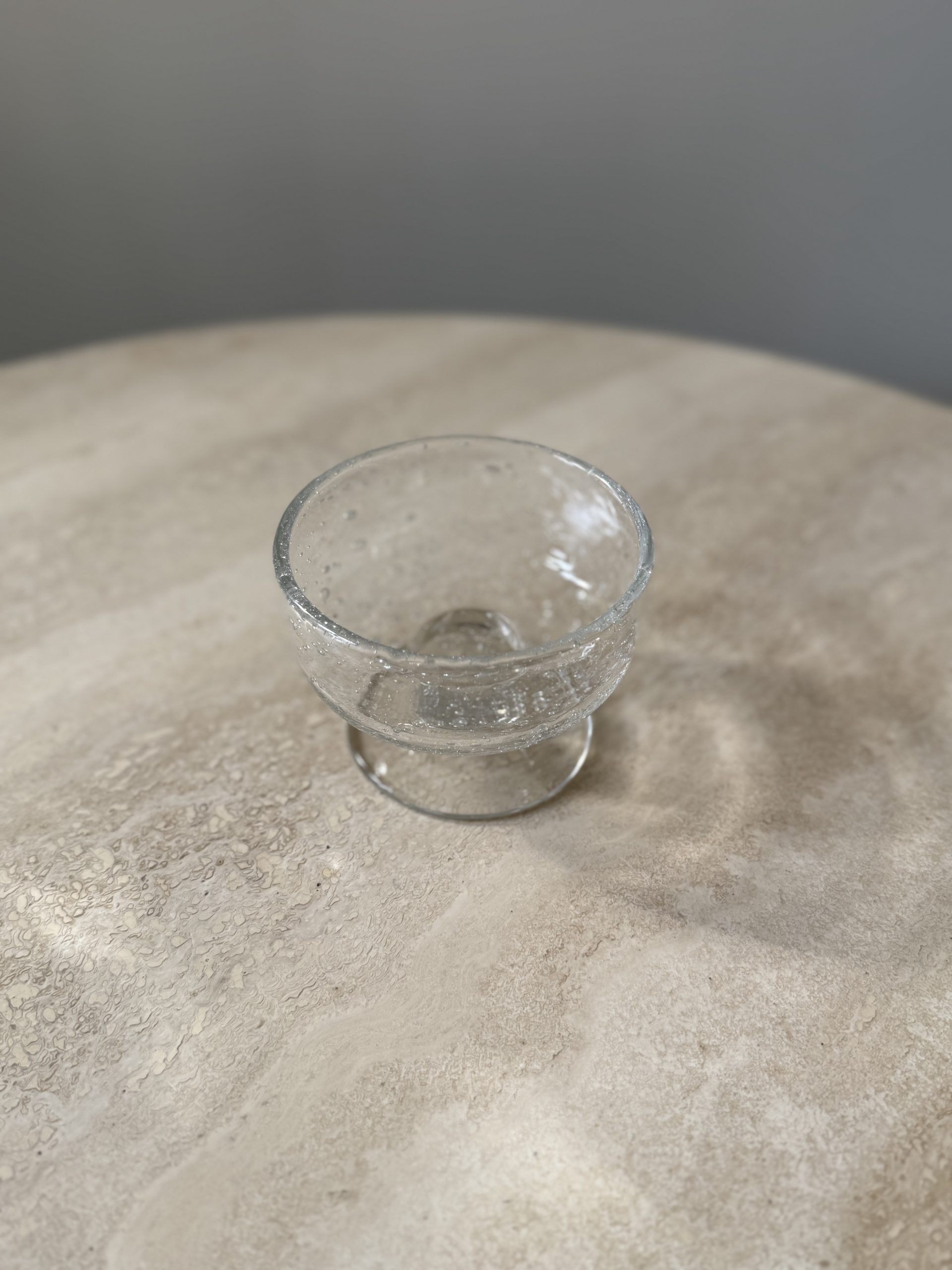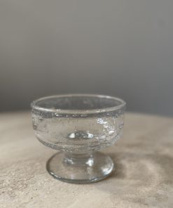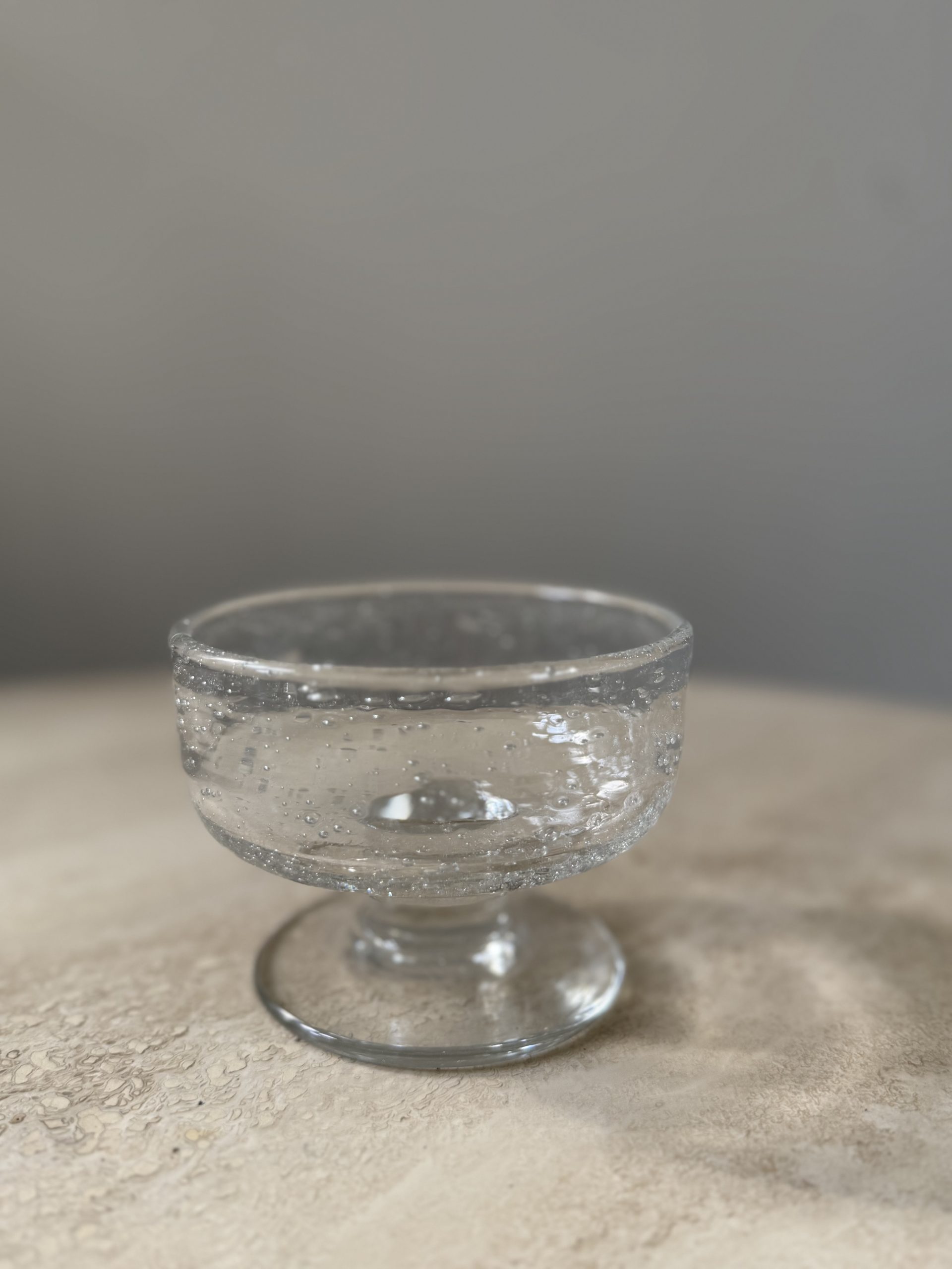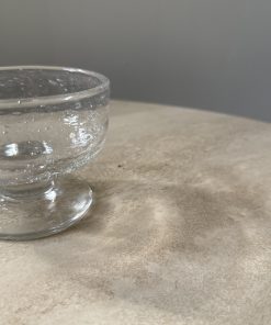 Bel ensemble à dessert en verre bullé composé d’un saladier et de cinq coupes sur pied assorties. Réalisé en verre épais transparent parsemé de nombreuses bulles emprisonnées dans la matière, cet ensemble évoque les productions artisanales provençales Biot, très populaires dans les années 1960 et 1970.