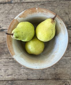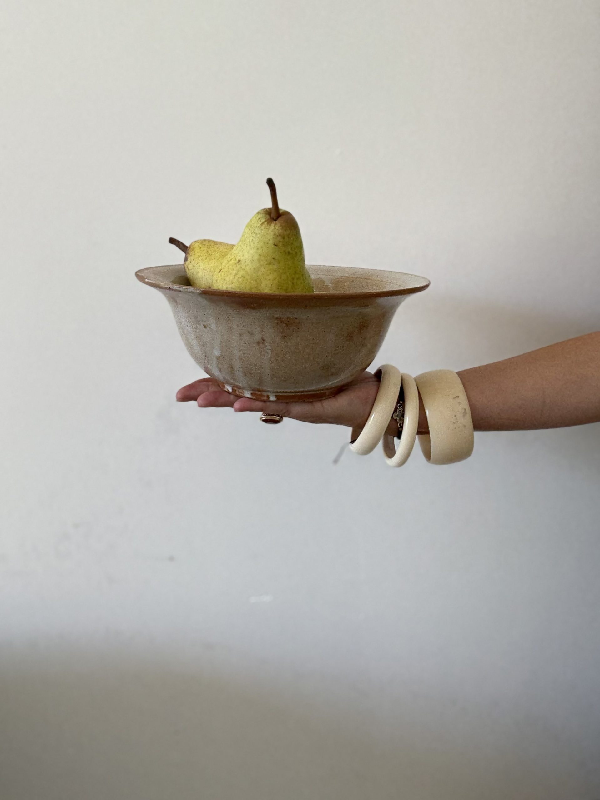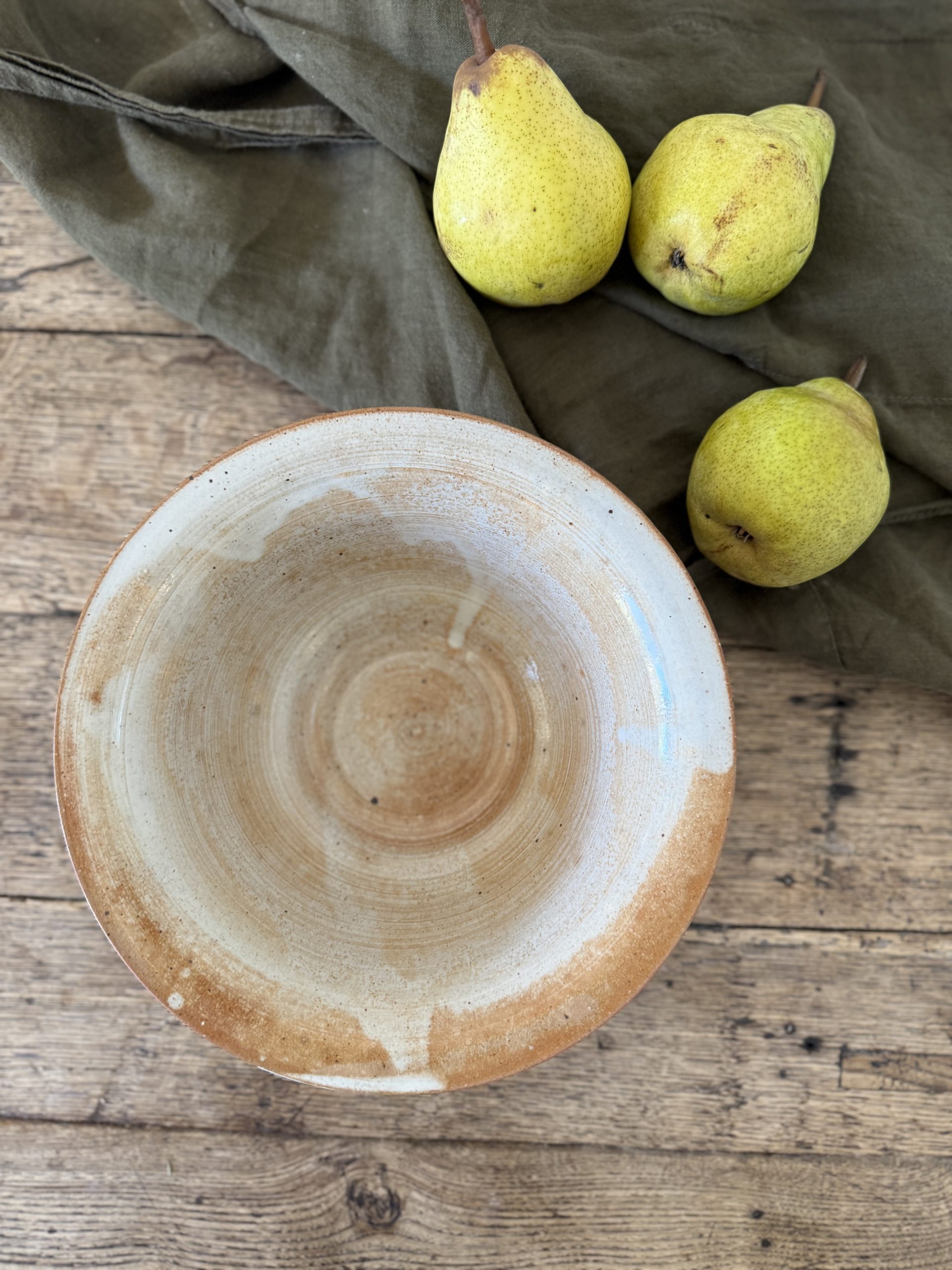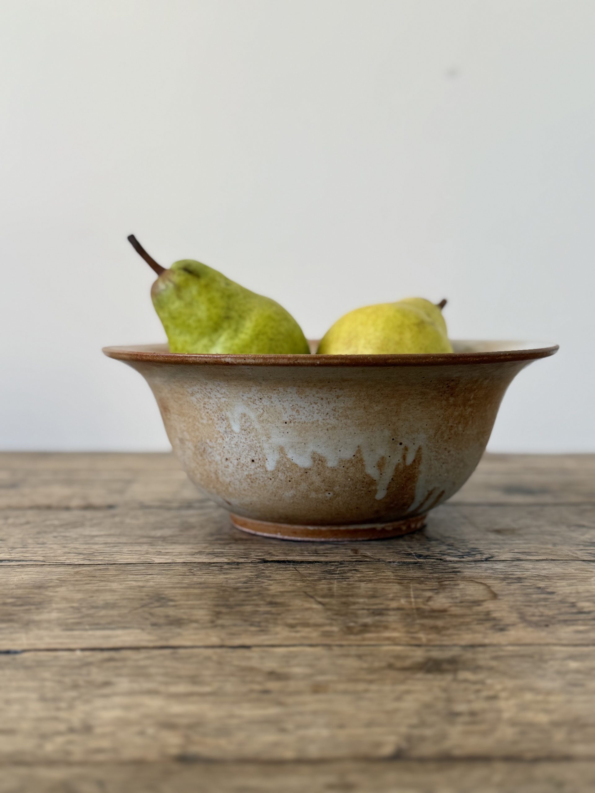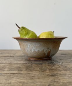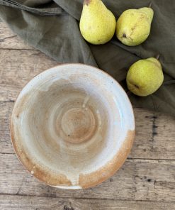 Petit saladier en grès tourné, émaillé dans une belle gamme de beiges et bruns, soulignée de coulures blanches typiques des cuissons artisanales.