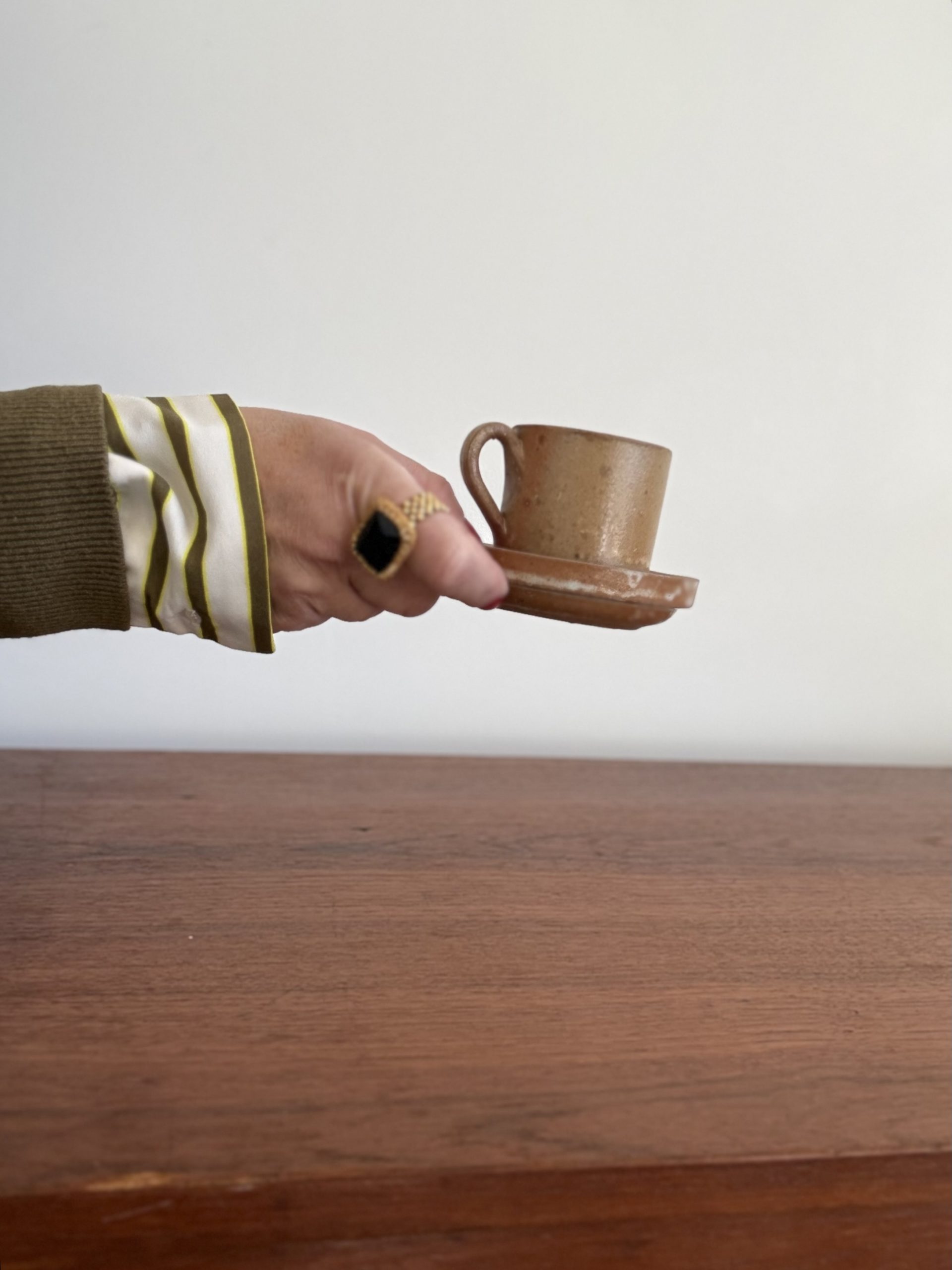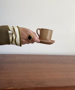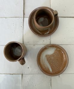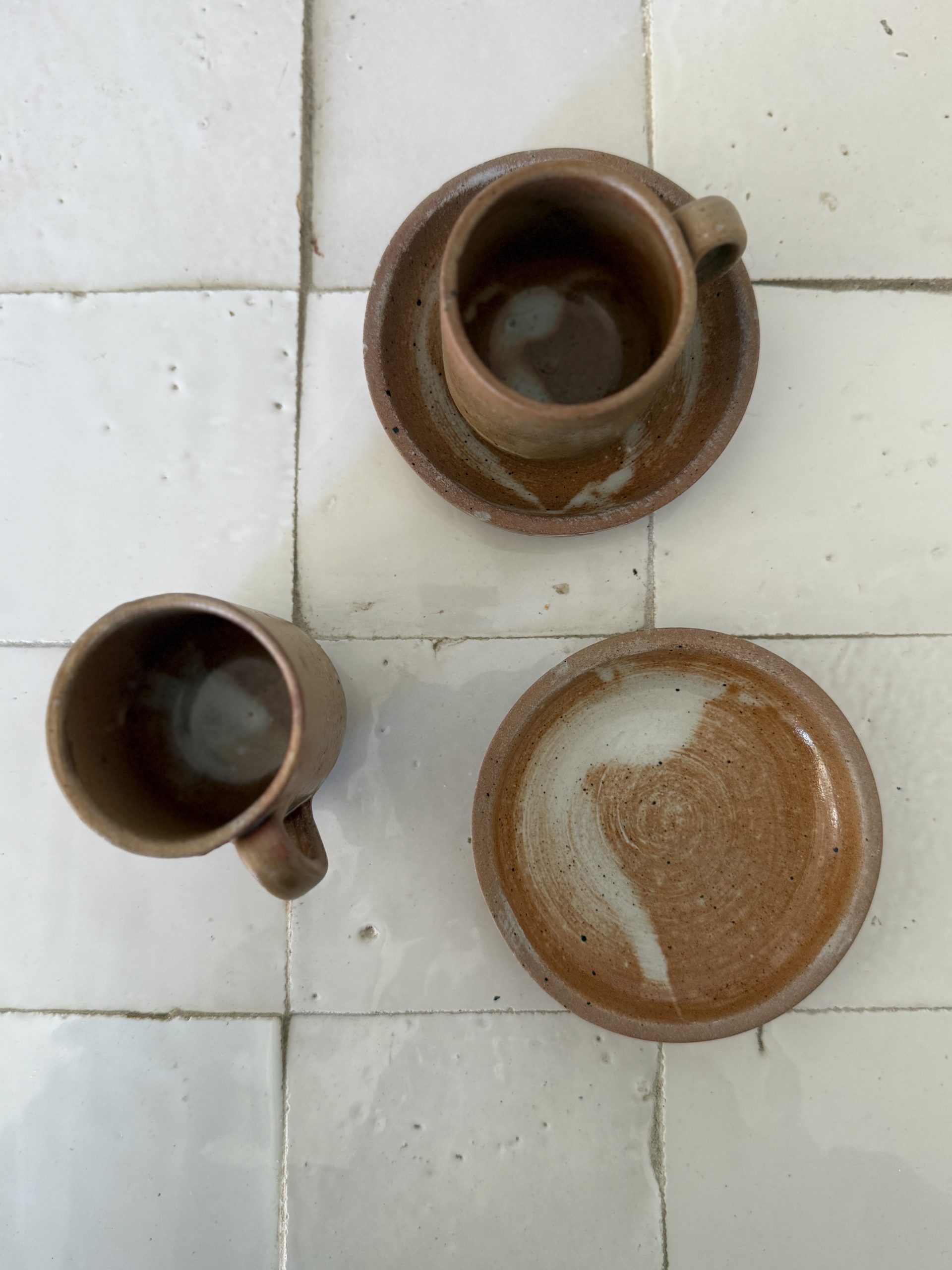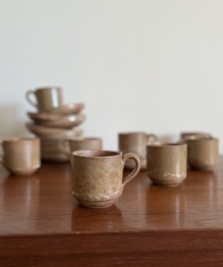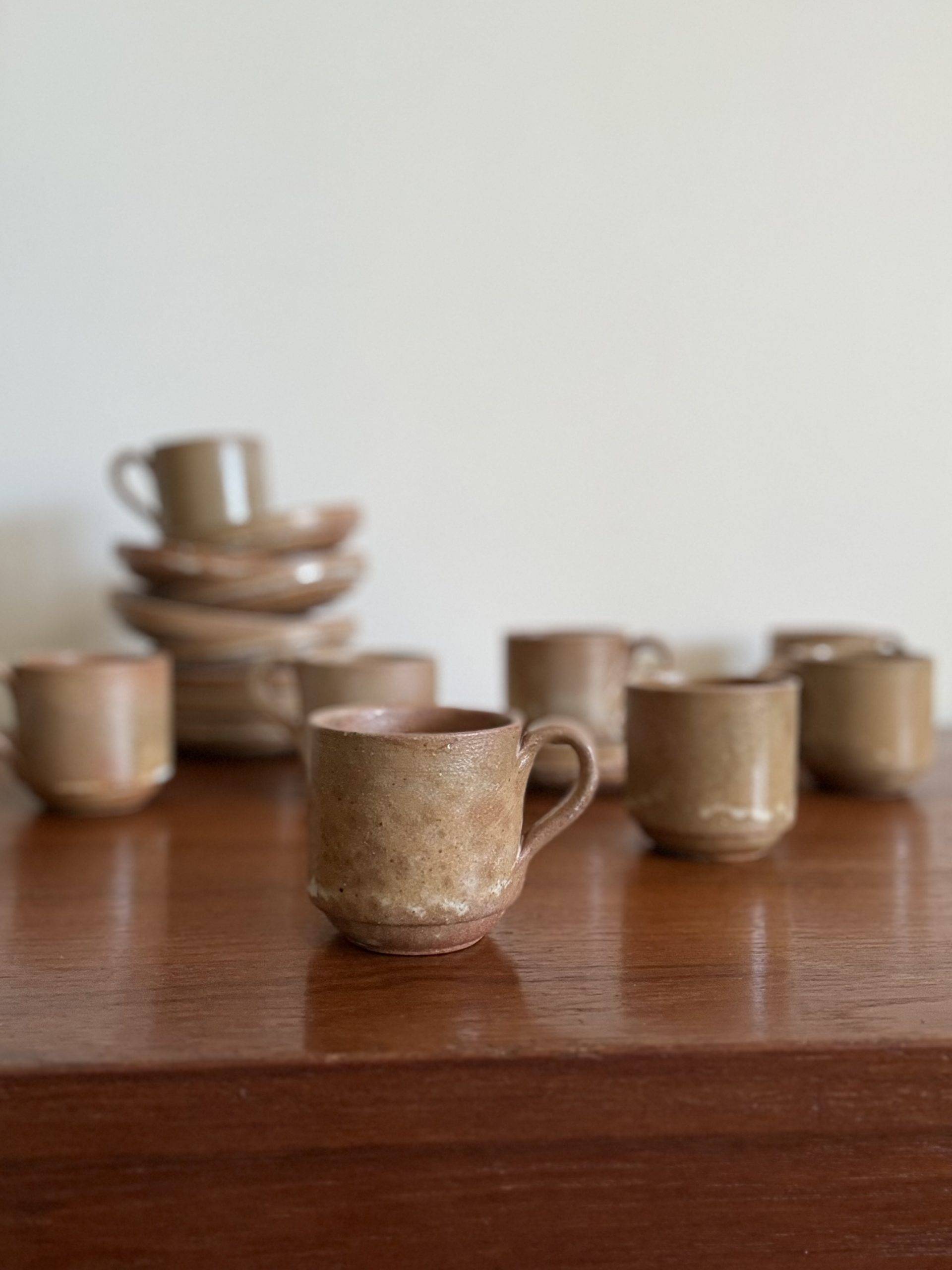Charmant service à espresso en grès émaillé brun aux nuances naturelles composé de 8 tasses et soucoupes.