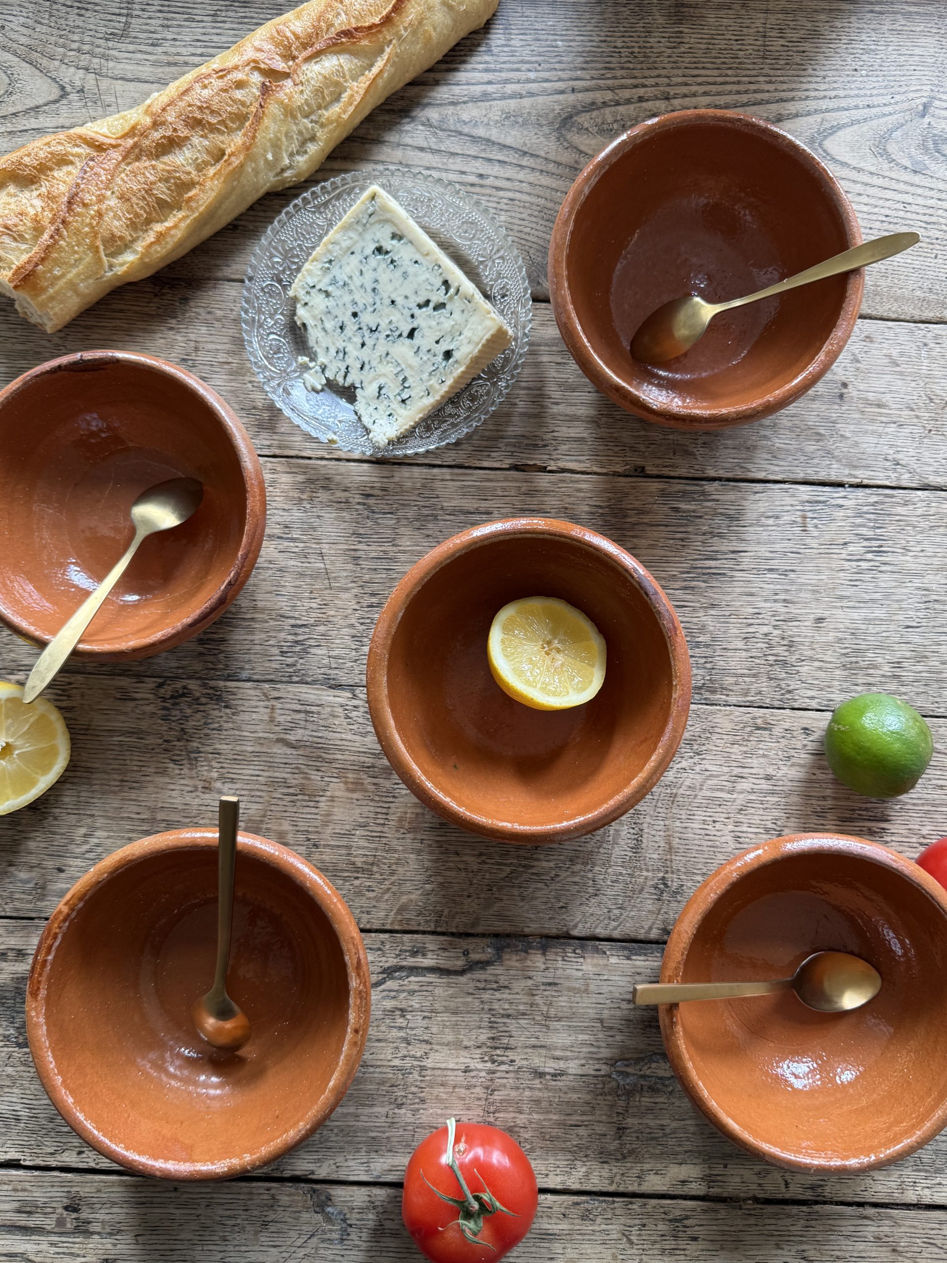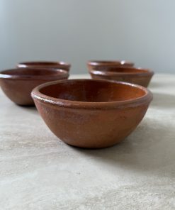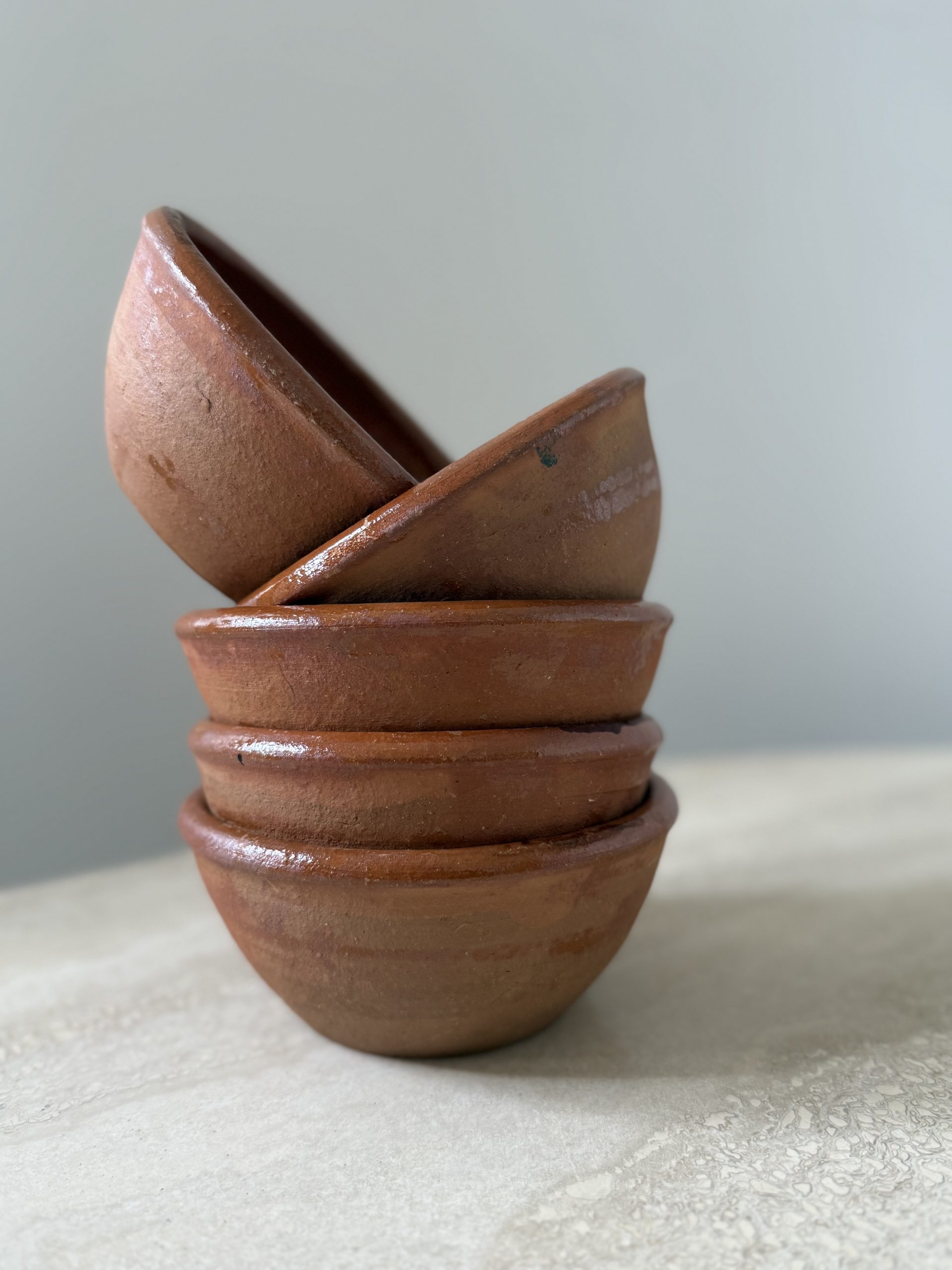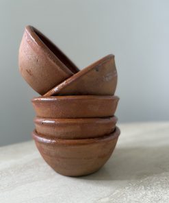 Réalisés en terre cuite épaisse puis recouverts d’un vernis transparent, ces bols présentent une surface légèrement irrégulière et une patine authentique qui témoignent de leur fabrication artisanale.