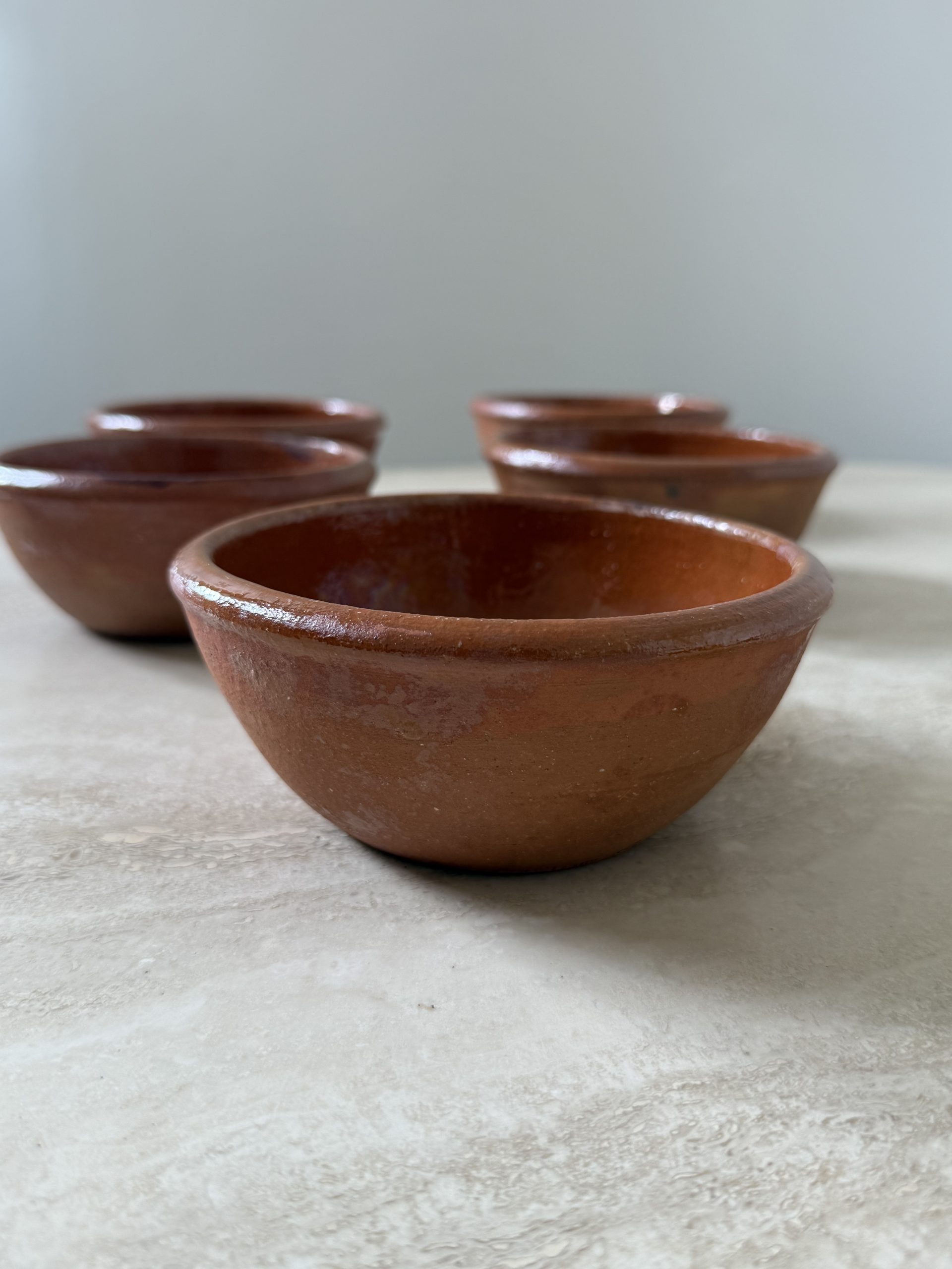 Suite de cinq bols en terre cuite vernissée dans une belle teinte brun chaud.
