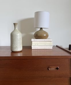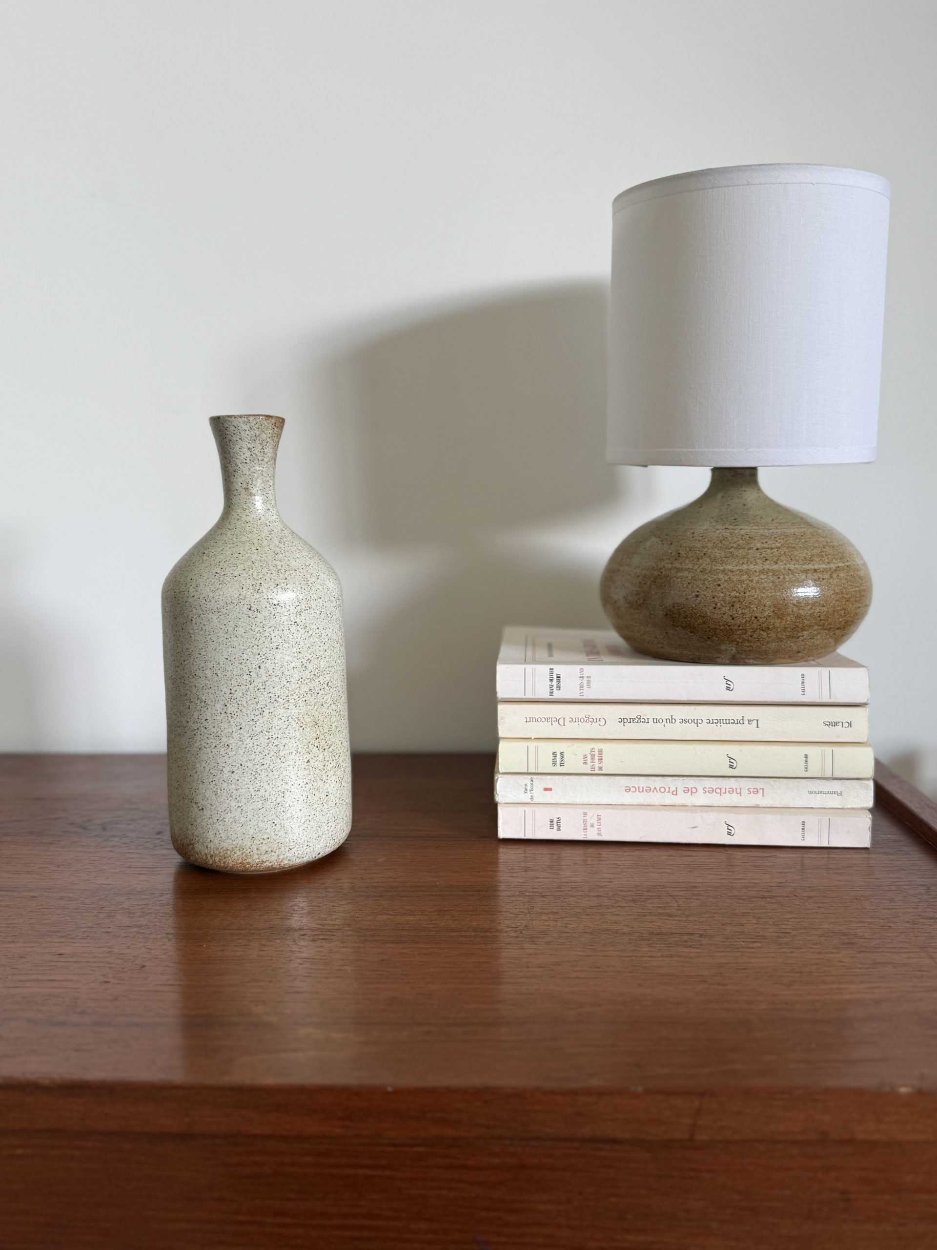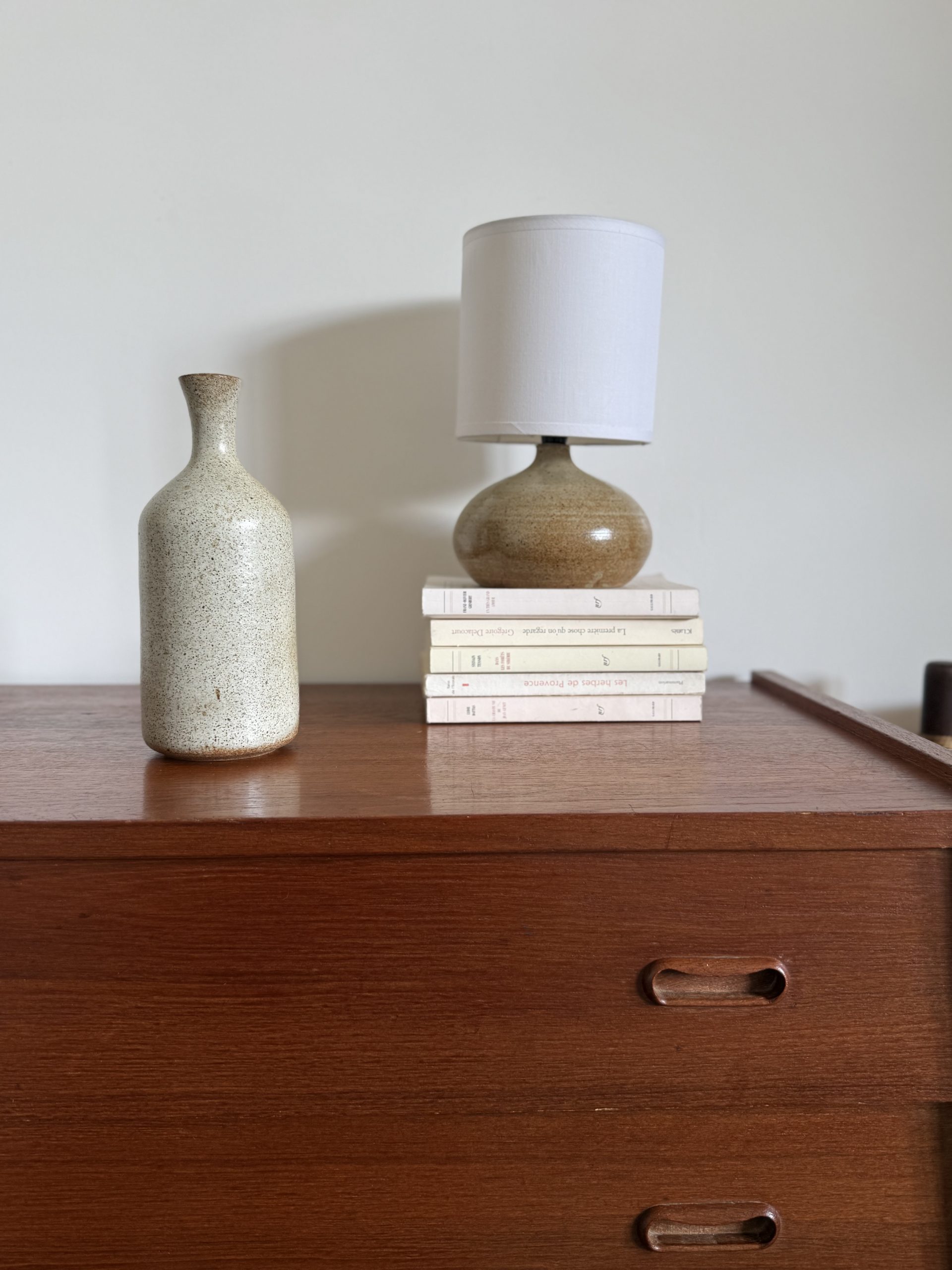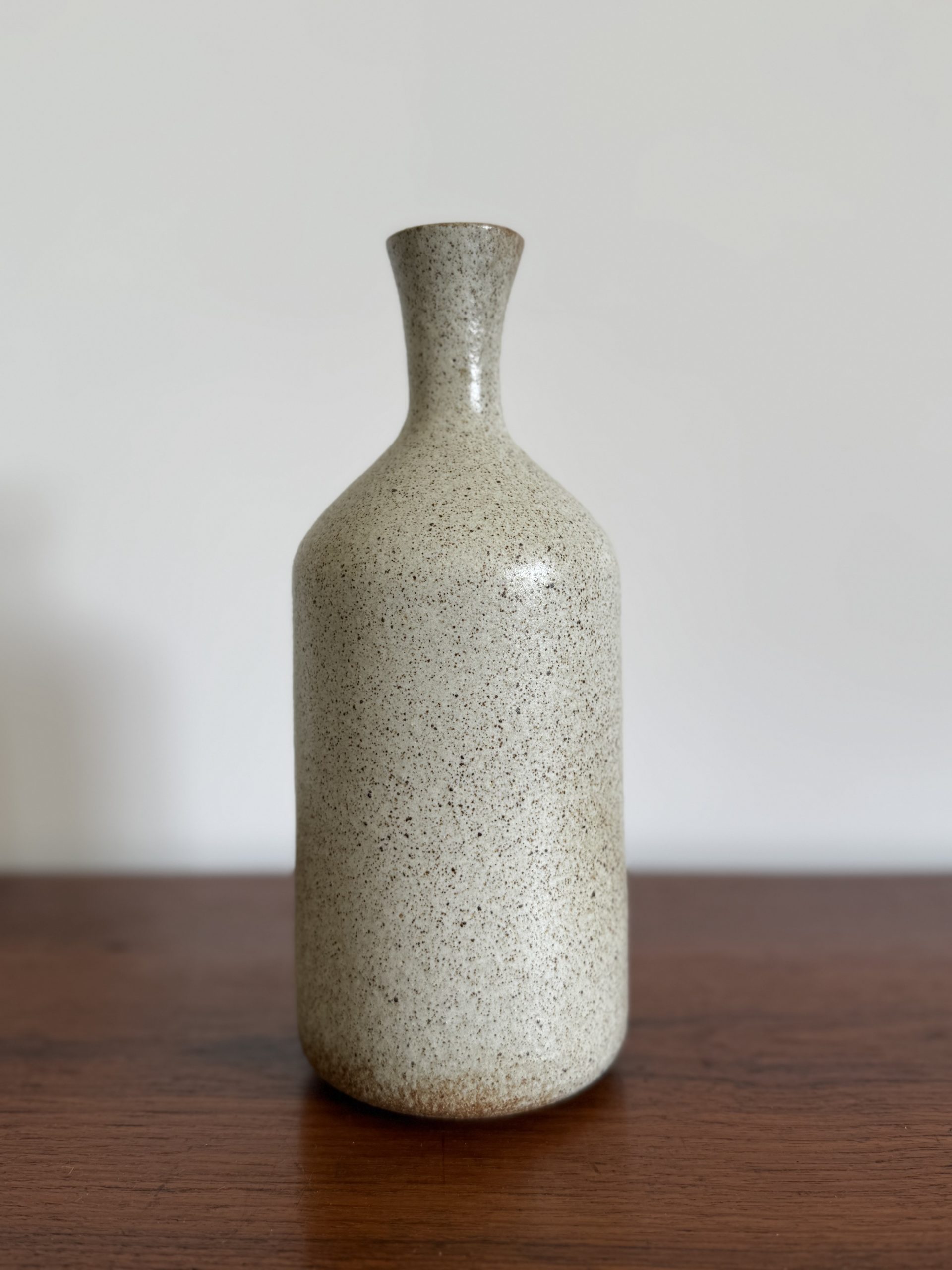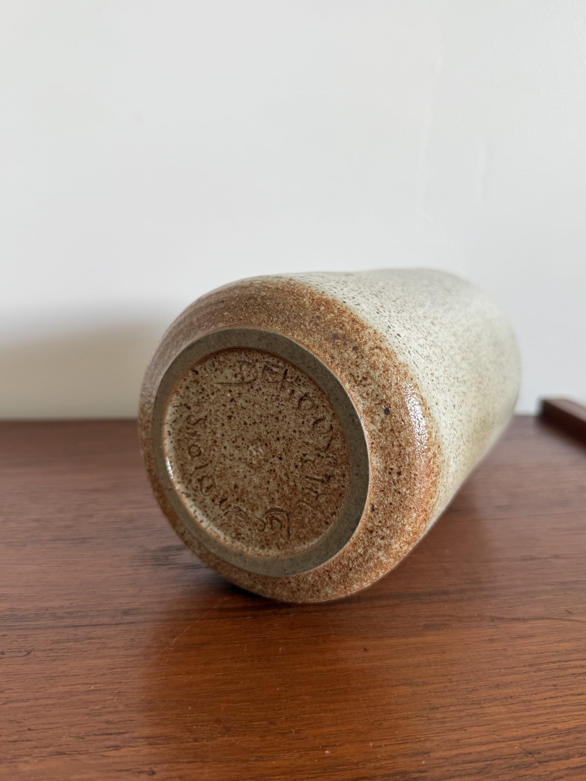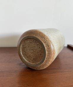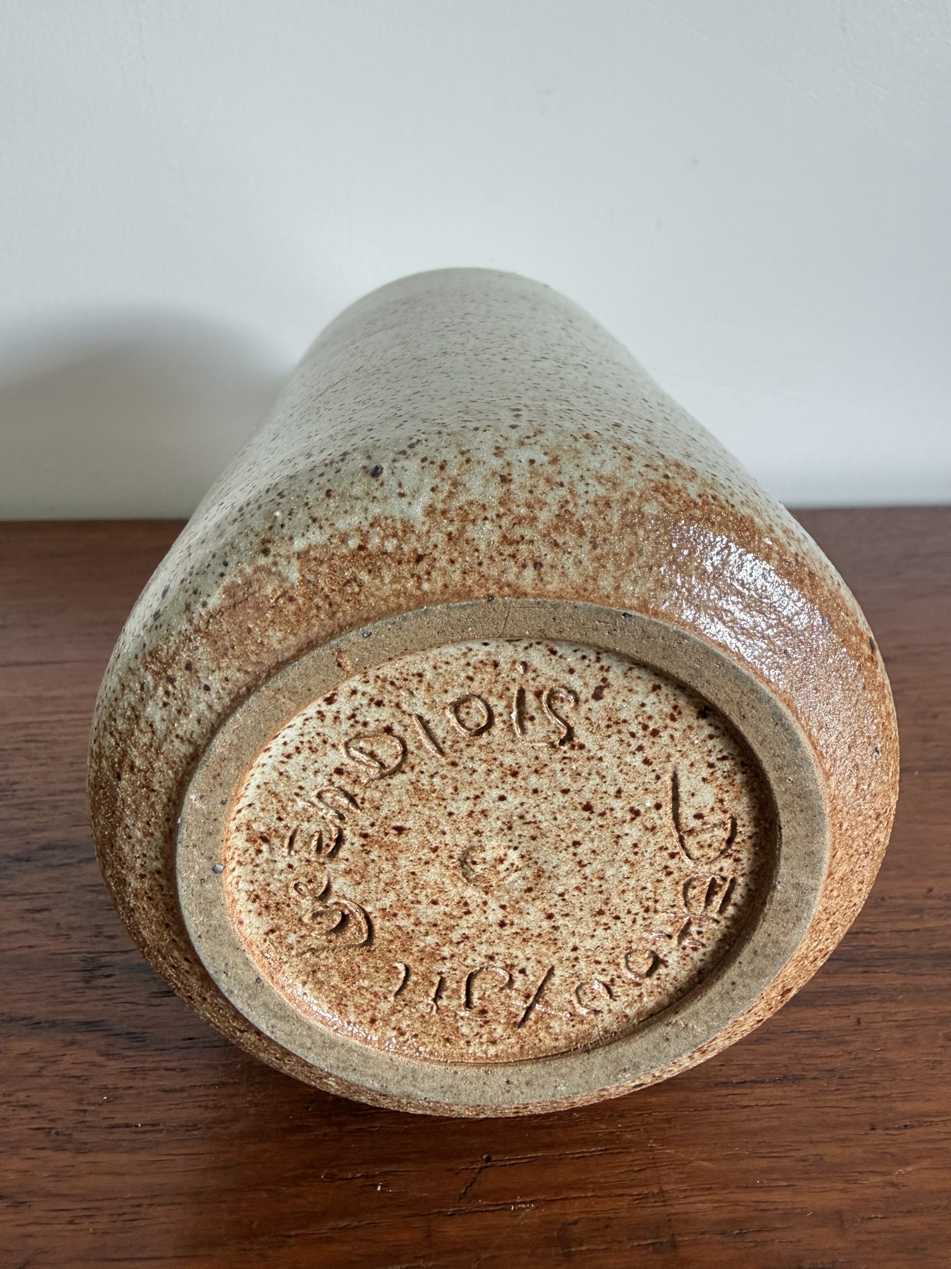Il est recouvert d’un émail moucheté aux nuances beige sable ponctué de fines inclusions brunes, caractéristique des grès artisanaux produits dans la Drôme dans les années 1970.